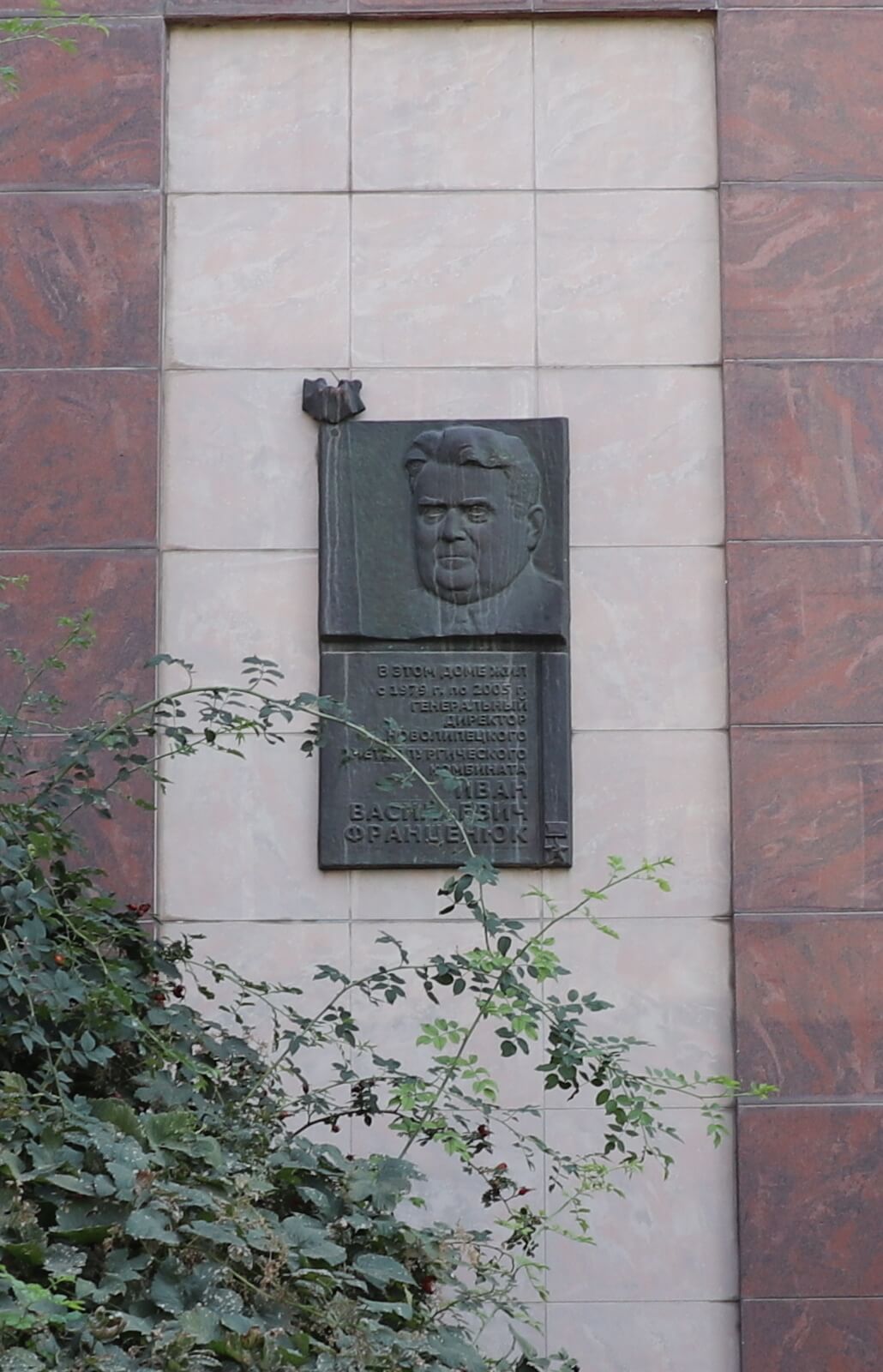 Мемориальная доска размещена на доме по адресу: ул. Кузнечная, 6. На ней рельефно изображено лицо И. В. Франценюка и выгравирована надпись: «В этом доме с 1979 по 2005 год жил генеральный директор Новолипецкого металлургического комбината И. В. Франценюк». Право открыть доску было предоставлено генеральному директору НЛМК Владимиру Настичу и главе администрации Липецка Михаилу Гулевскому.