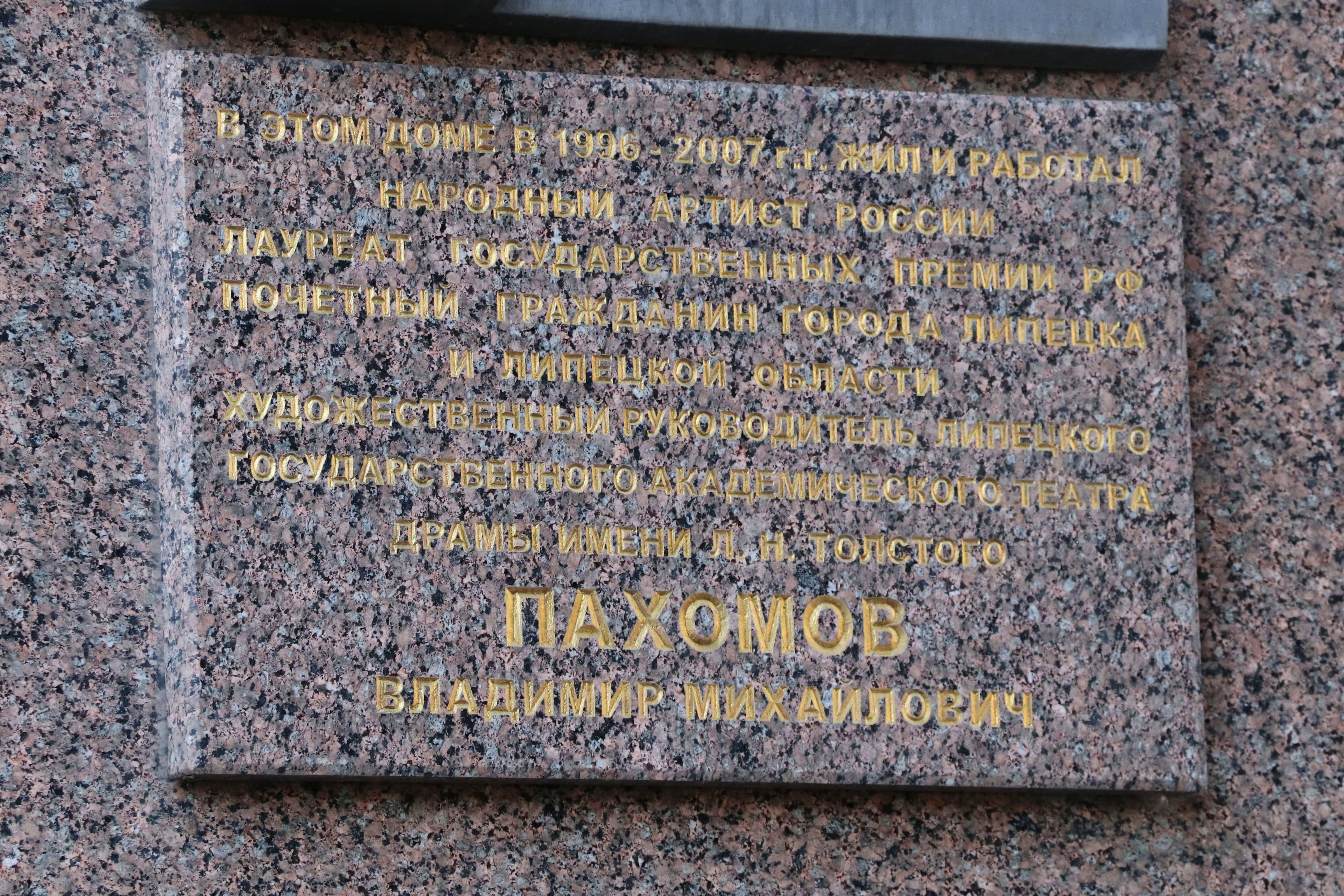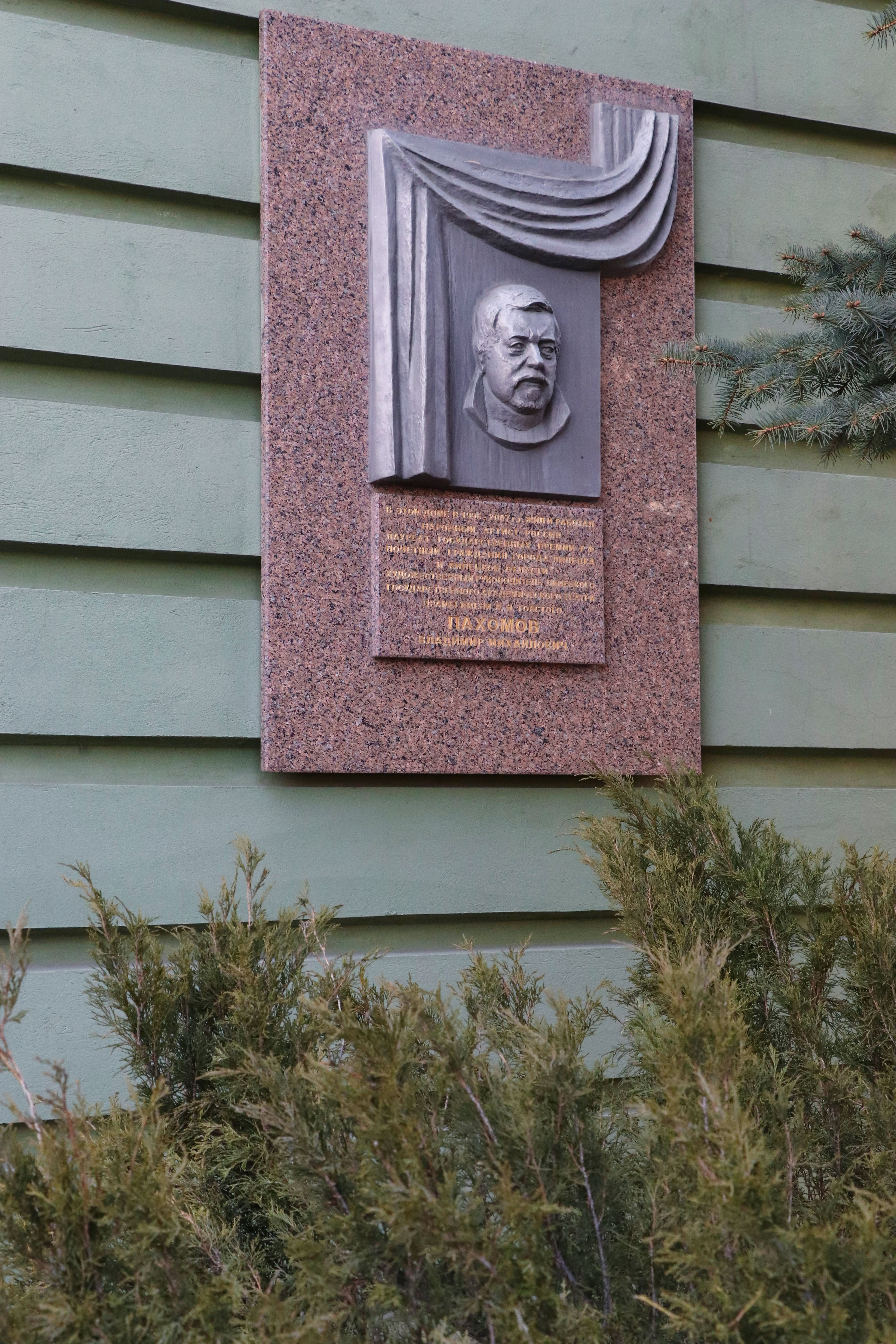 Торжественное открытие мемориальной доски, установленной на фасаде дома № 7 на ул. Ворошилова, состоялось 17 ноября 2008 г., в первую годовщину смерти народного артиста России Владимира Михайловича Пахомова, более 30 лет возглавлявшего Липецкий государственный академический театр драмы им. Льва Толстого. Авторы барельефа – Ю. Гришко и И. Мазур.