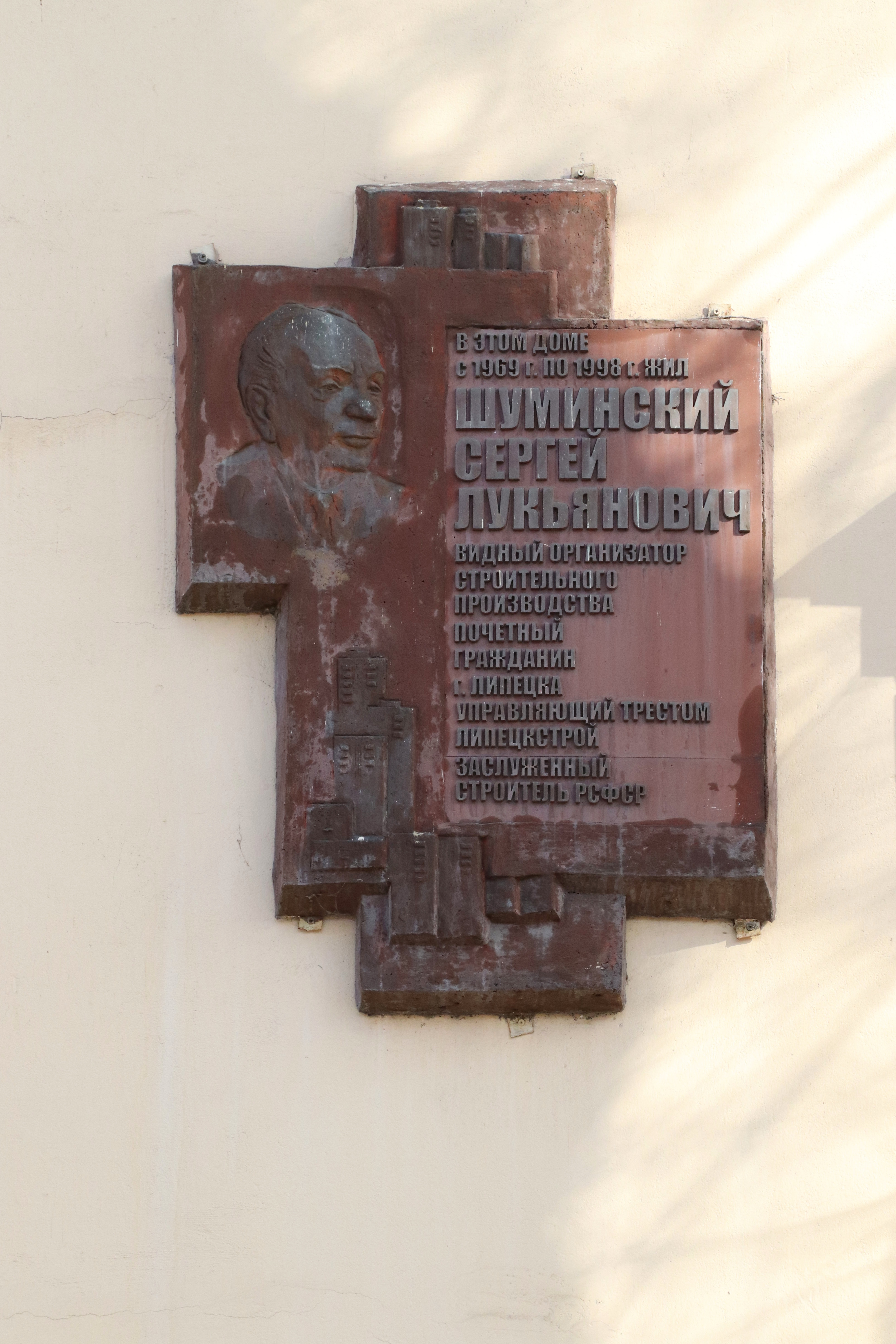 В Липецке мемориальная доска, увековечивающая память управляющего трестом «Липецкстрой», заслуженного строителя РСФСР, почетного гражданина Сергея Лукьяновича Шуминского, установлена в 2011 году на фасаде дома, где он жил (ул. Горького, 26). В этом доме он прожил почти 30 лет.