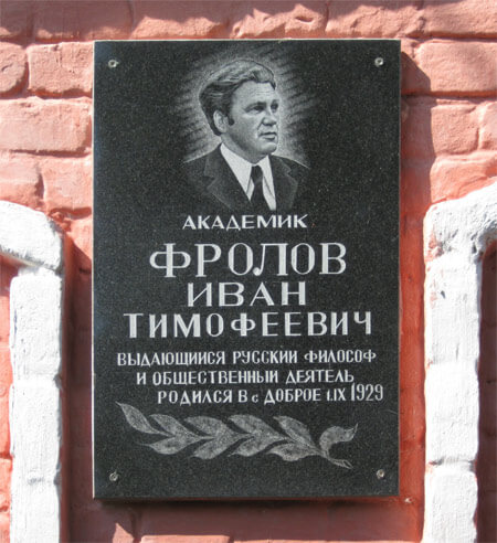 - Федоров В. Память не подвластна времени : [об увековечении в с. Доброе Добров. р-на памяти его уроженца – ученого, философа, основателя и первого директора Ин-та человека РАН, создателя журнала «Человек», крупнейшего обществ. И полит. деятеля И. Т. Фролова] // Знамя Октября [Добров. р-н]. – 2014. – 18 нояб.: фото.
