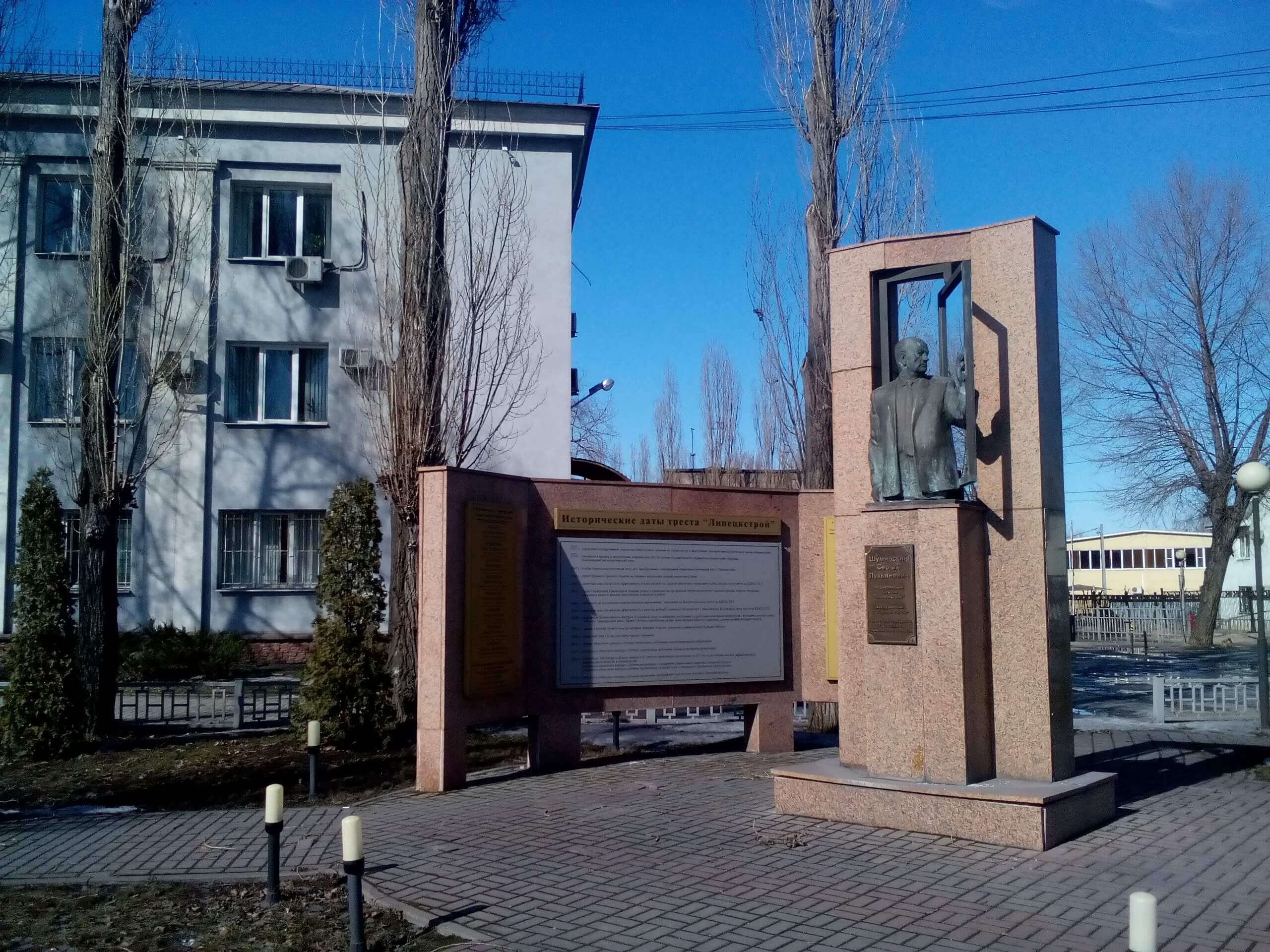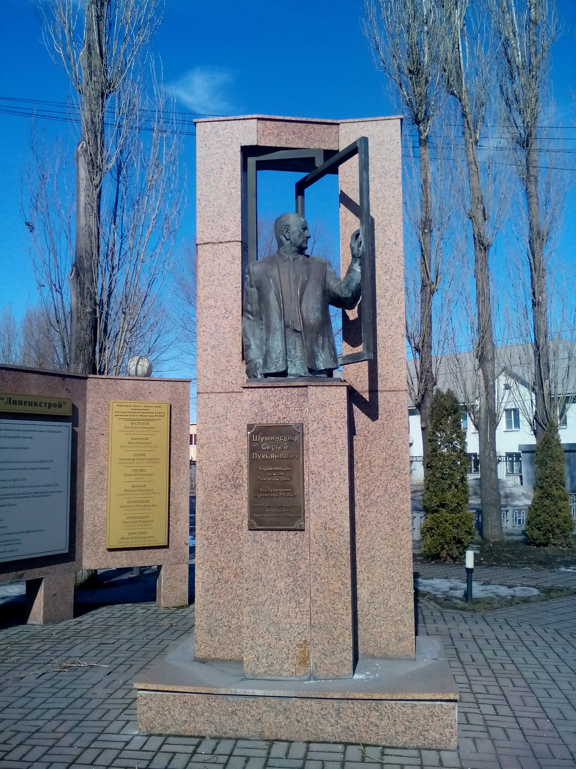 Памятник Сергею Лукьяновичу Шуминскому – почетному гражданину города Липецка, управляющему трестом «Липецкстрой» (1952-1971 гг.), установлен в областном центре на улице 9 Мая рядом с административным зданием треста «Липецкстрой».
