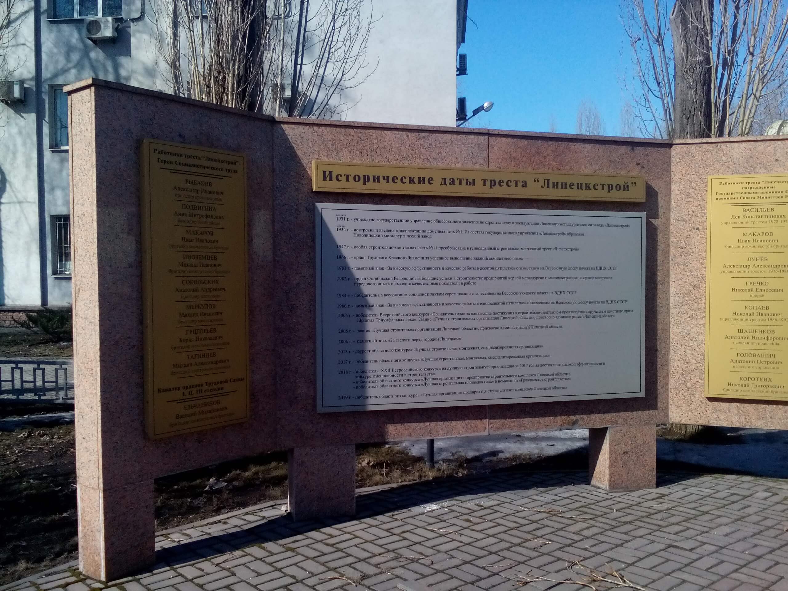 Рядом с памятником расположена мраморная стела, на которой отмечены работники треста «Липецкстрой» – Герои Социалистического труда: Рыбаков А. И., Подвигина А. М., Макаров И. И., Сокольских А. А., Меркулов М. И., Тагинцев М. А.; кавалер орденов Трудовой Славы I, II, III степени – Ельчанинов В. М.; работники треста «Липецкстрой», награжденные Государственными премиями СССР и премиями Совета Министров РСФСР; в центре стелы – исторические даты треста «Липецкстрой».
