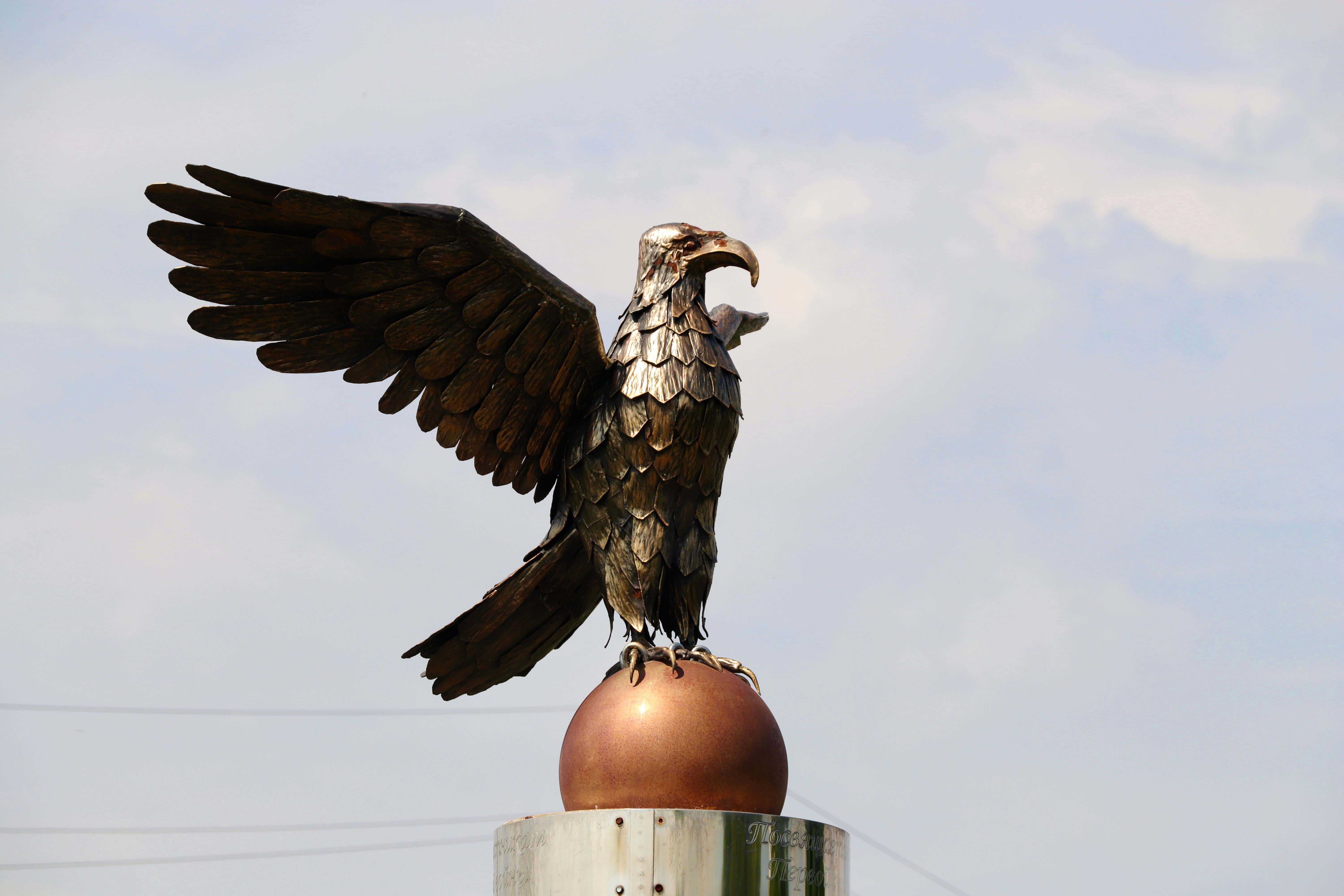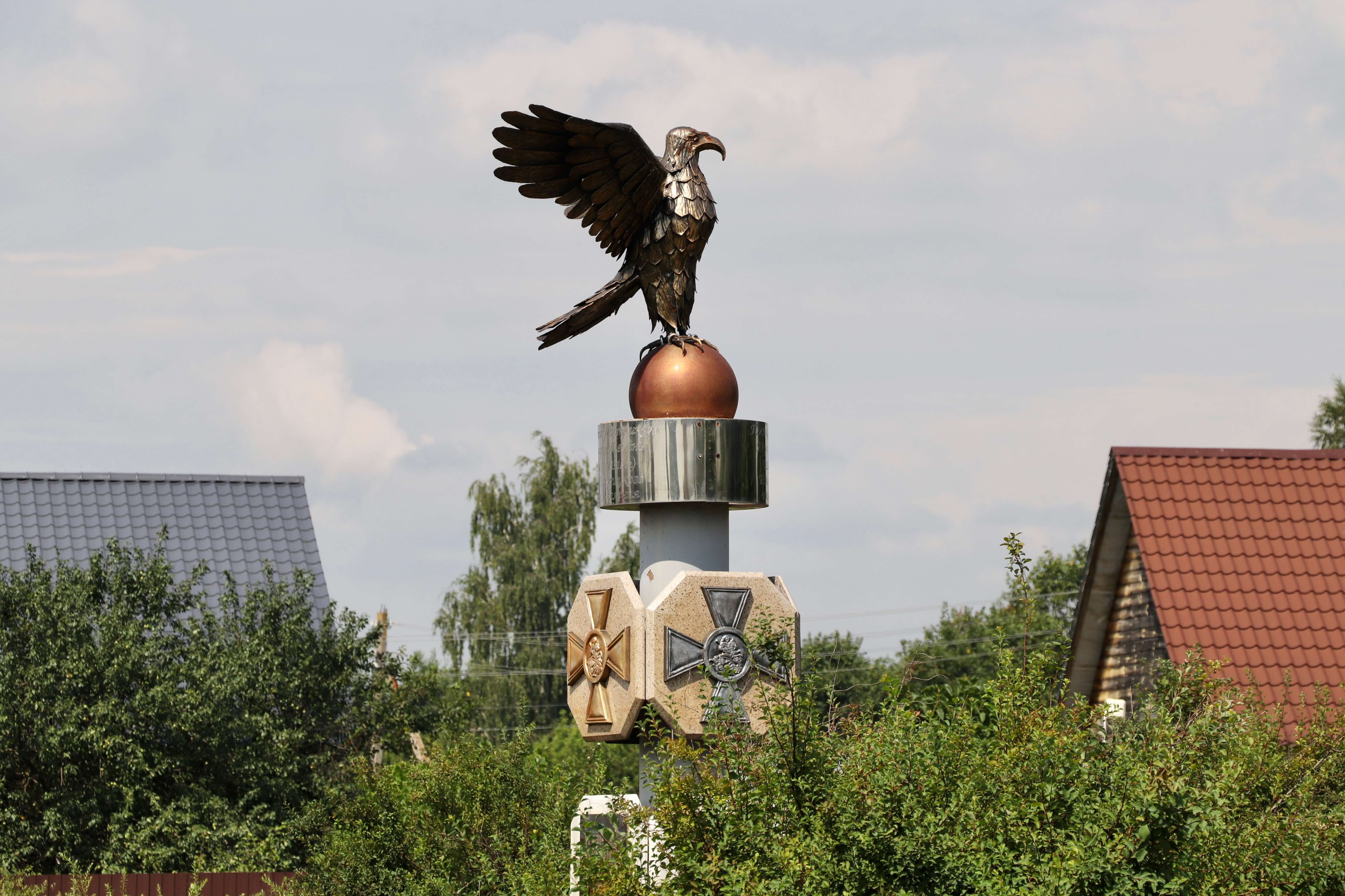 В центре композиции стоит высокий серый столб, увенчанный золотой полусферой, на которой возвышается бронзовая фигура орла с распростертыми крыльями. На столбе закреплены памятные таблички с изображениями крестов и надписями.