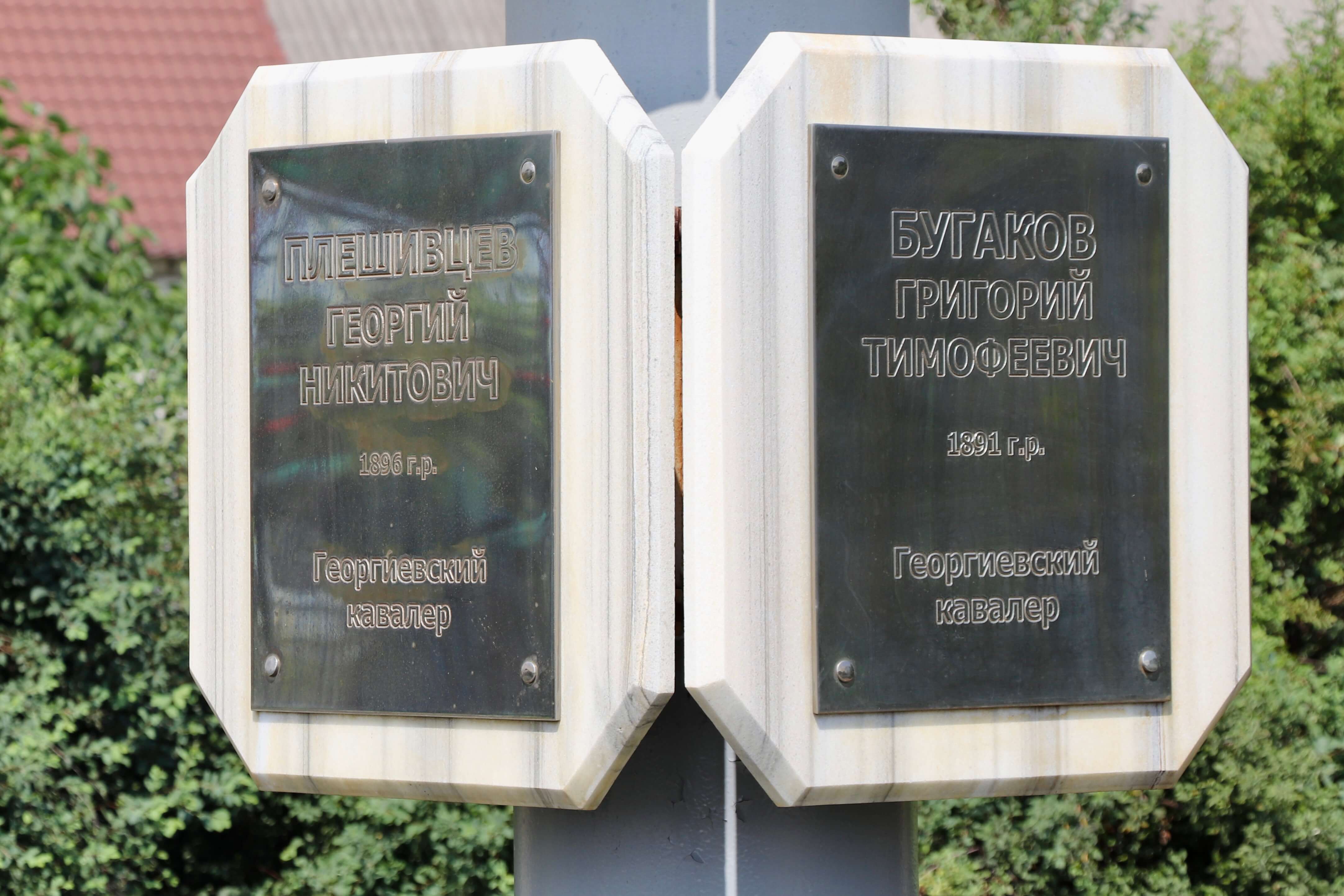 На металлических табличках выгравированы имена Георгиевских кавалеров: Григория Тимофеевича Бугакова, Александра Тихоновича Шуленина, Филиппа Тимофеевича Бугакова, Георгия Никитовича Плешивцева.