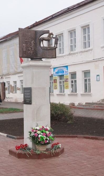 Двухметровая белокаменная колонна увенчана распахнутым бронзовым томом «Записок охотника». На левой странице книги - барельеф со сценой ярмарки, на правой – скульптурка лошади, которую держит под уздцы заводчик.