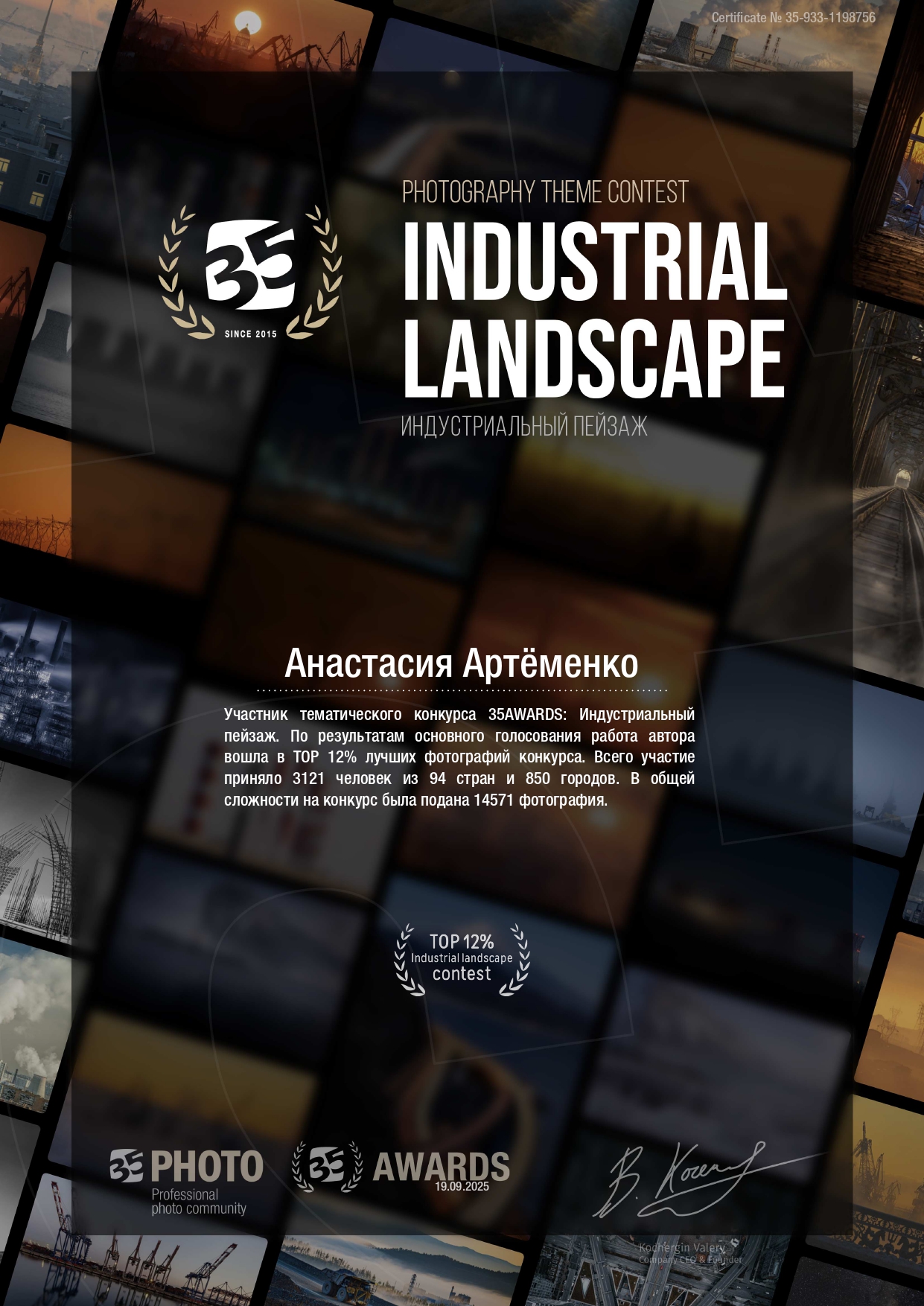 Анастасия Артеменко представила свою фотографию в тематическом конкурсе «Индустриальный пейзаж». Её работа «Новолипецкий комбинат. Индустриальный рассвет», снятая весной 2025 года, по результатам основного голосования вошла в TOP 12% лучших фотографий конкурса.